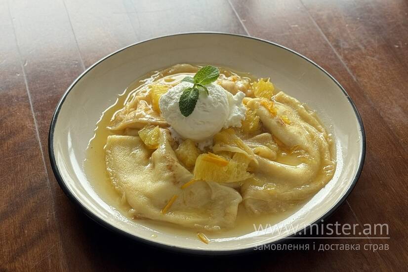 Тонкі млинці в ароматному апельсиновому соусі з вершковим маслом і карамелізованим цукром, з легкою цитрусовою ноткою. *під час транспортування, морозиво може підтанути.