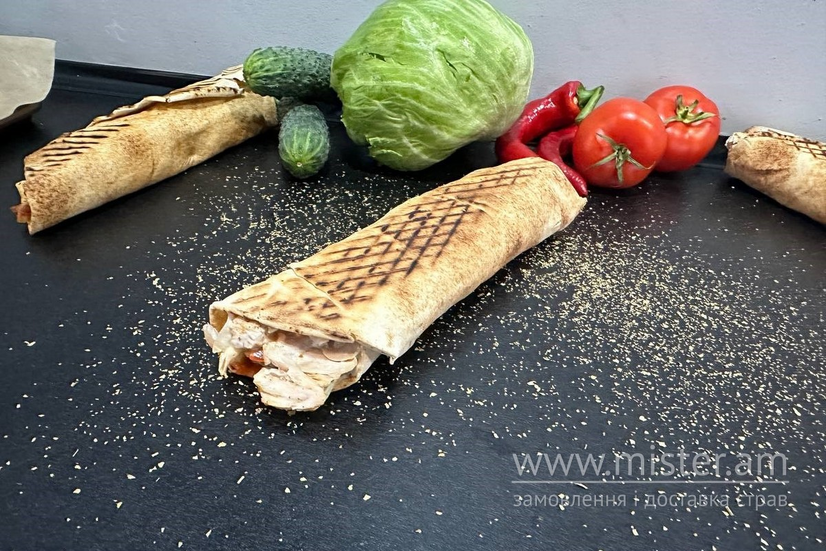 Лаваш, пекінська капуста, помідор, курятина, сир сулугуні, сметанно-часниковий соус, вафля, томатний соус.