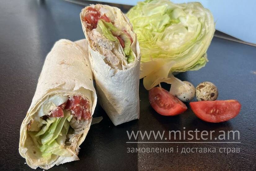 Лаваш, салат айсберг, пармезан, курка, яйце перепелине, помідор, сухарики, соус власного виробництва.
