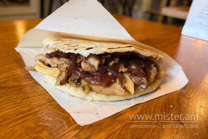 Піта, мʼясо курки, картопля, карамелізована цибуля, соус сметано-часниковий, соус BBQ.