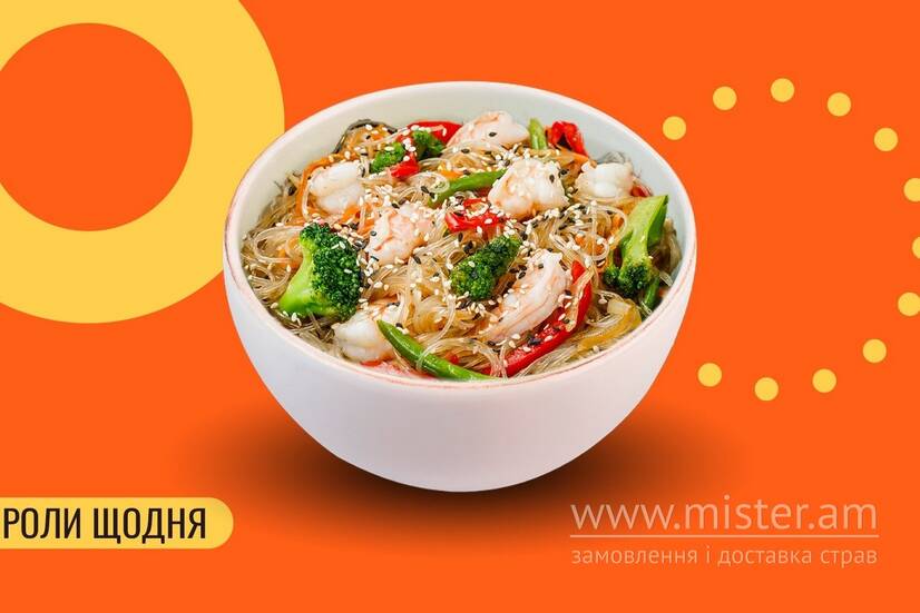 Локшина фунчоза, креветки, броколі, спаржа, цибуля ріпчаста, морква, перець болгарський, часник, соус Пеппер, кунжут.
