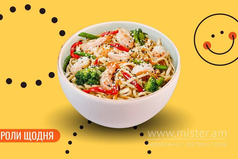 Локшина удон, креветки, броколі, спаржа, цибуля ріпчаста, морква, перець болгарський, часник, соус Пеппер, кунжут.
