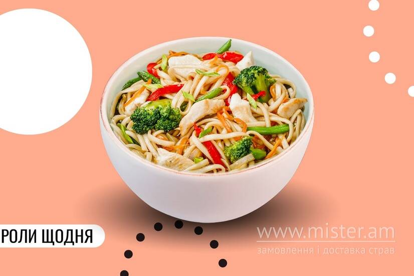 Локшина удон, куряче філе, броколі, спаржа, цибуля ріпчаста, морква, перець болгарський, часник, соус Устричний, цибуля зелена.