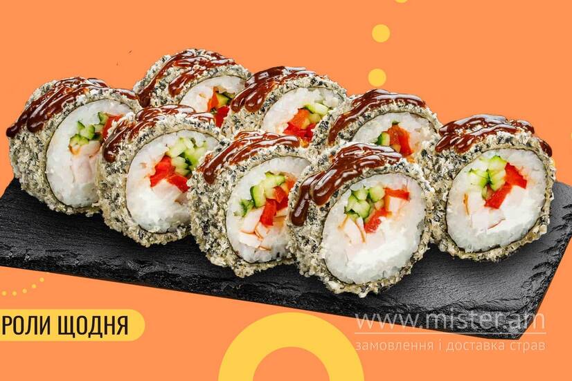 Рис, копчена курка, крем сир, кляр темпура, огірок, перець болгарський, соус горіховий унагі, сухарі панко, норі.