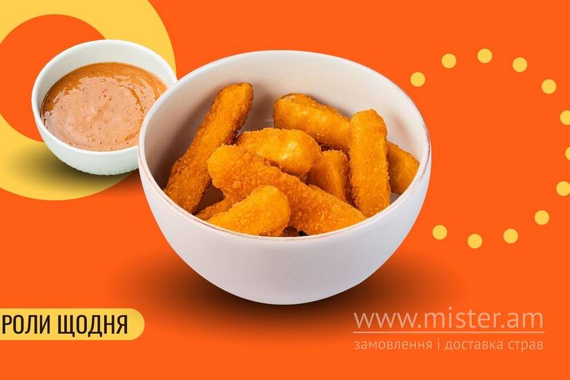 Куряче філе, яйце, панірувальні сухарі, борошно темпура, сіль, перець, соус горіховий (гострий).