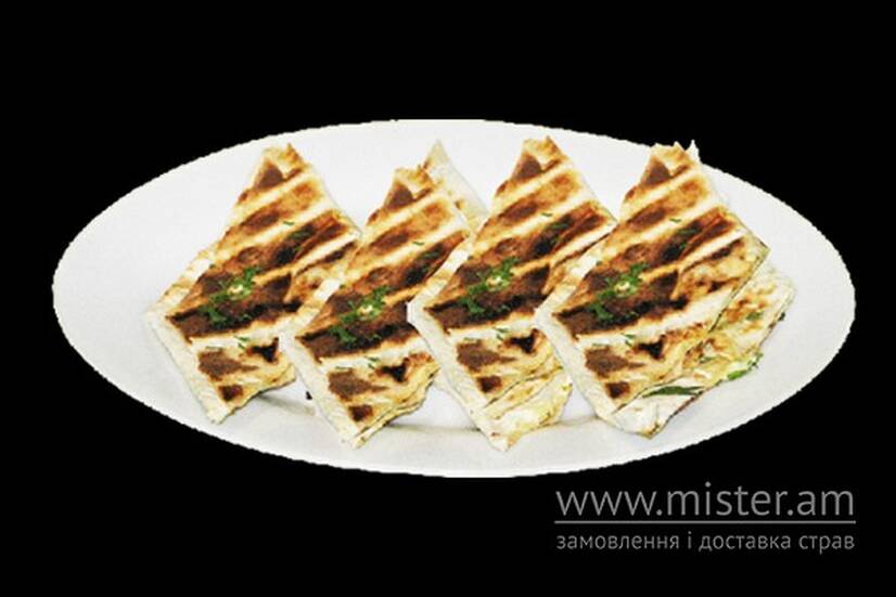 Тонкий лаваш загортається із сулугуні, білим соусом та зеленню та підсмажується до розтоплення начинки.