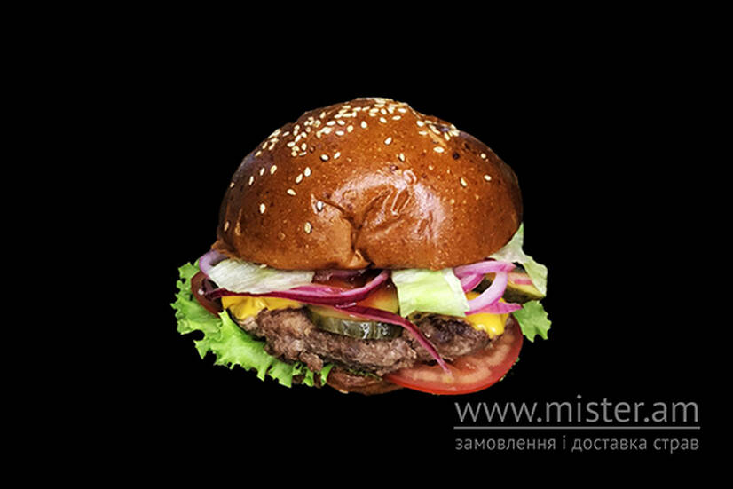 Булка з кунжутом, котлета з телятини, тостовий сир Чеддер, помідор, маринований огірок, салат Латук, салат Айсберг, червона цибуля, соус Барбекю, білий соус.