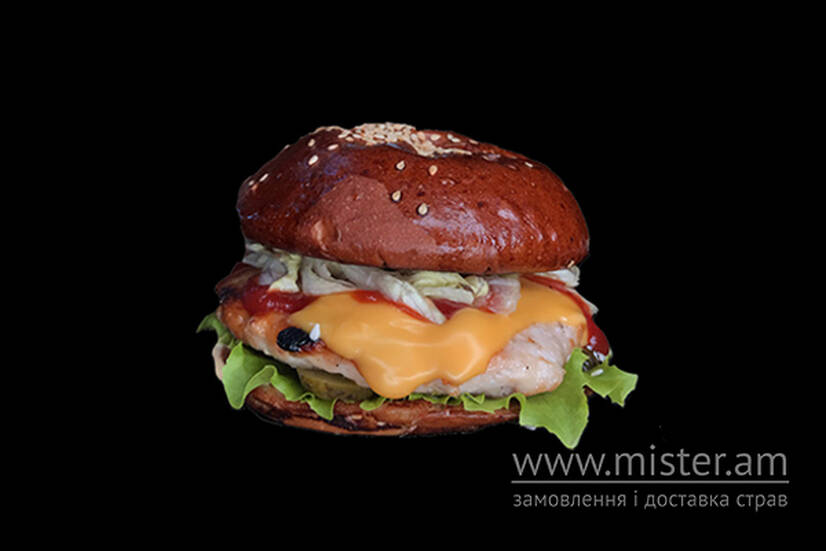Котлета куряча, тостовий сир Чеддер, булка з кунжутом, салат Латук, салат Айсберг, маринований огірок.