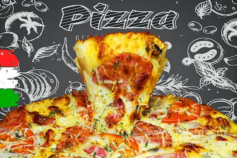 Комбінація сирної піци та піци з салямі, копченим беконом, мисливськими ковбасками на вершковому соусі.