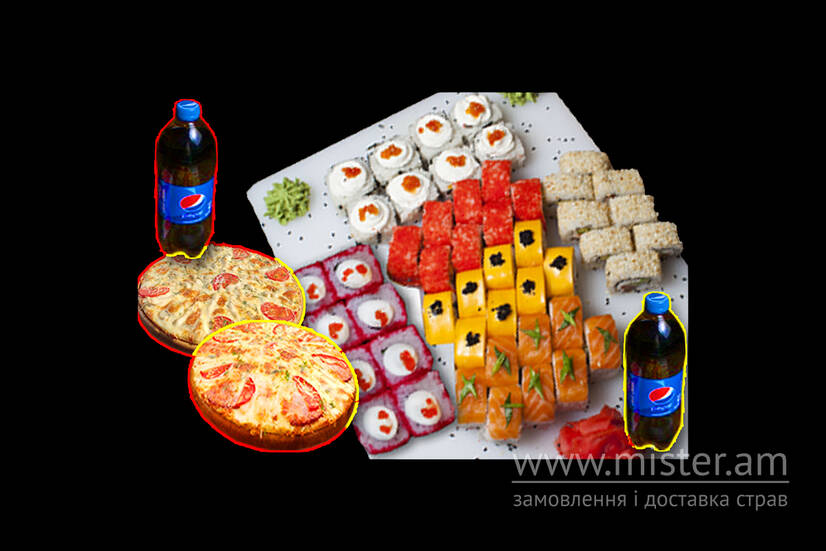 Філадельфія з лососем, Каліфорнія з лососем, Сирний, З лососем в кунжуті, З лососем та крем-сиром, Цезар. Подарунок: піца "Фірмова", піца "Маринована курка", Пепсі 2 л.