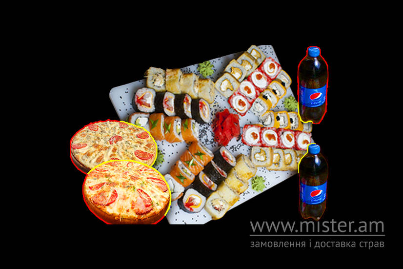 Філадельфія з лососем, Сирний, Цезар смажений, Три сири смажений, З лососем у масаго, Футомакі з креветкою. Подарунок: піца "Фірмова", піца "Маринована курка", Пепсі 2 л.