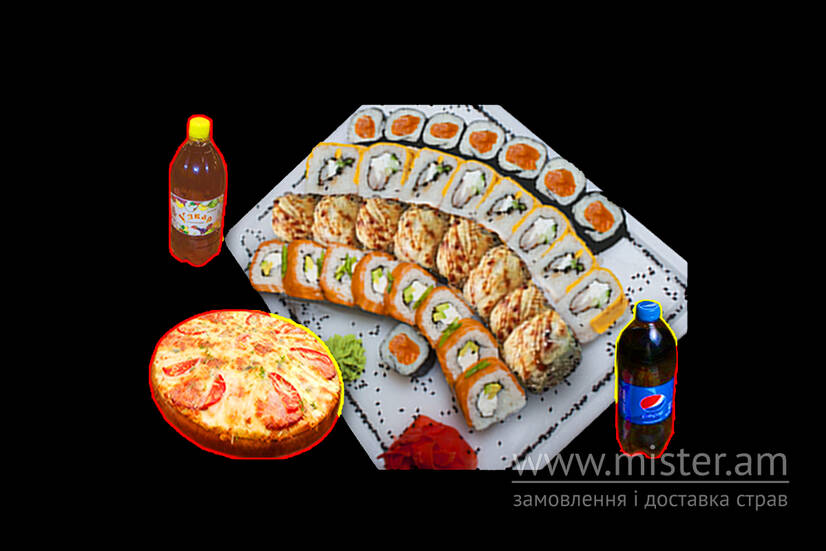 Філадельфія з лососем, Макі з лососем, З лососем та ананасом фламбе, Філадельфія Темпура. Подарунок: піца "Фірмова", напої 2 л.