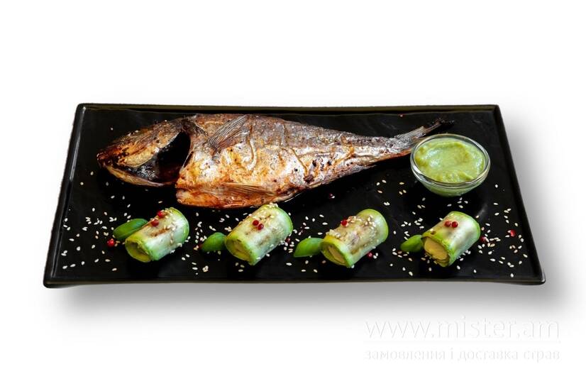 З кабачковими рулетиками з фетою і кунжутом та шпинатним соусом. УВАГА! Страва вагова, ціна вказана за 100 г, кінцеву вартість заклад узгодить з Вами телефоном.