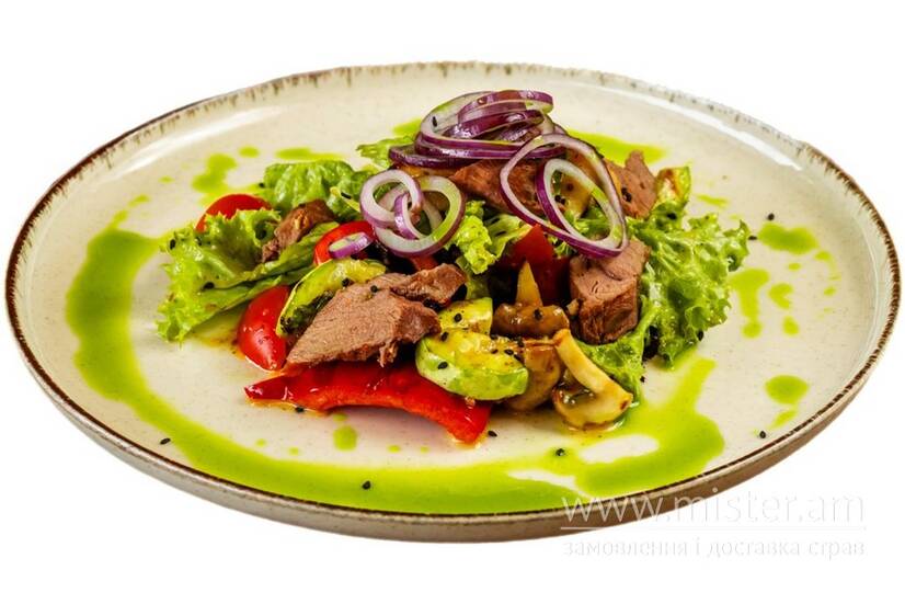 Телятина, кабачок, помідор, печериці, кримська цибуля, перець болгарський, мікс-салату, шпинат, медово-гірчичний соус.