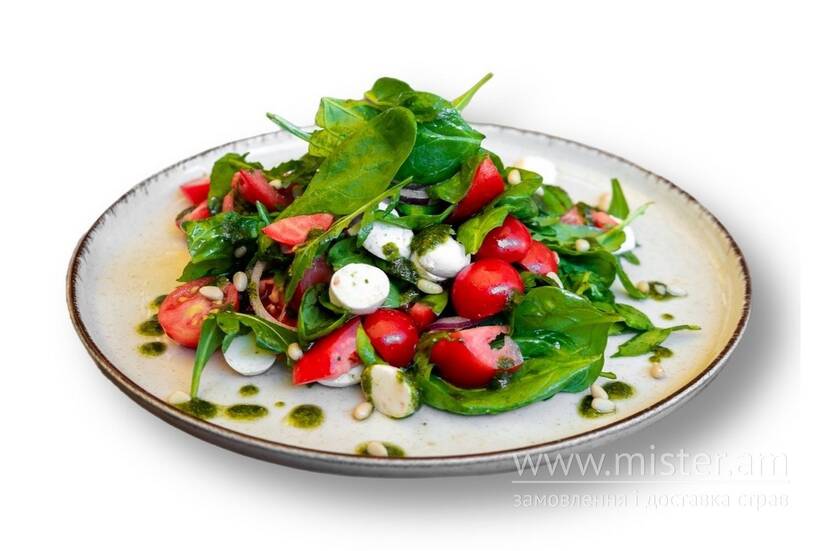 Сир моцарела, помідор, помідори черрі, шпинат, кедрові горіхи, цибуля кримська, соус песто.