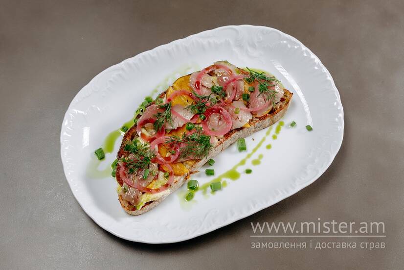 Ніжна рибка, ікорне масло, маринована цибуля та зелень на свіжому тартіні.