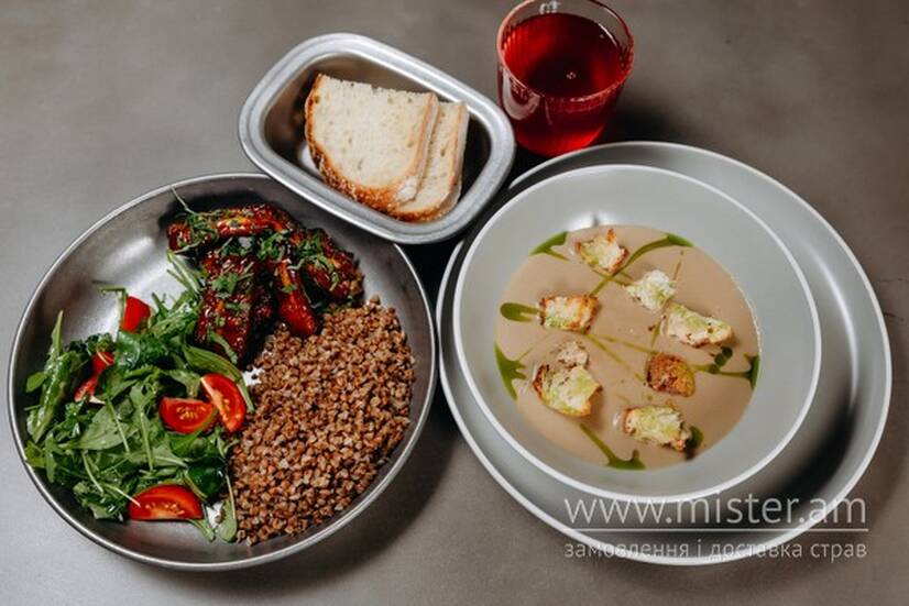 Грибний крем-суп, гречка з ребрами BBQ, салат зі шпинату, руколою та томатами чері з оливковою олією, компот.