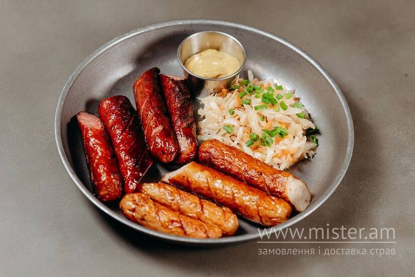 Чотири вида ковбасок, подаємо з маринованими чері та гірчицею.