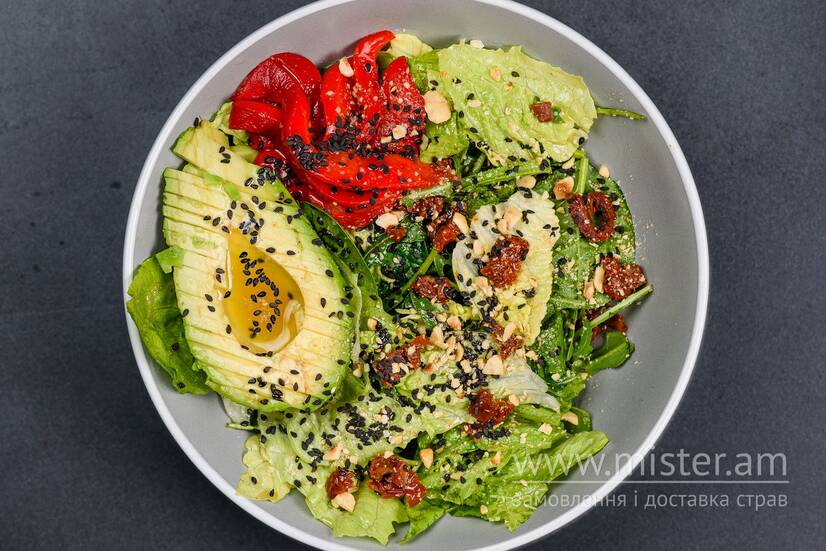 Салат, авокадо, в`ялені томати, печений перець, фундук.