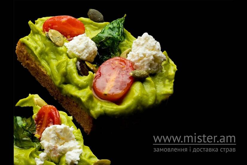 Брускета, мус авокадо, сир фета, томати чері, базилік, гарбузове насіння, трюфельна олія.