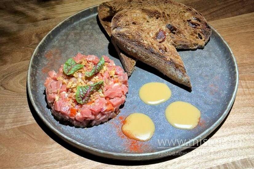 Яловича вирізка, соус медово-гірчичний, цибуля кранч, грінки.