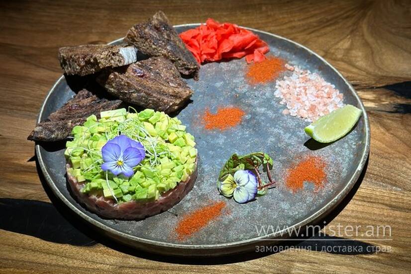 Тунець, авокадо, цибуля, імбир маринований, оливкова олія, грінки, соус.