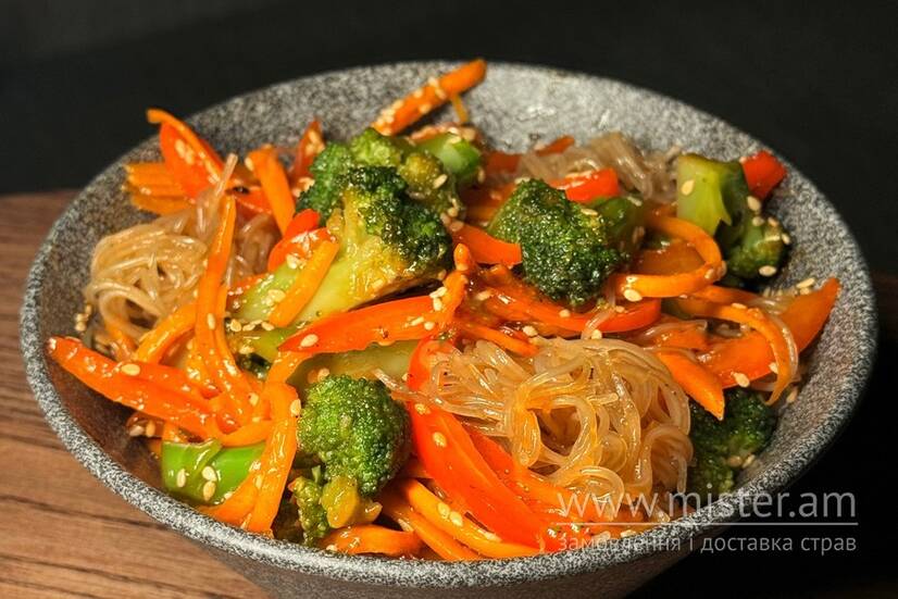 Локшина фунчоза, соус теріякі та глазур, броколі, перець болгарський, морква, кунжут, рисові чіпси.