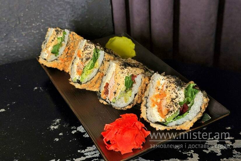 Рис, крем-сир, куряче філе в паніровці, сир чеддер, огірок, салат мікс, соус цезар.