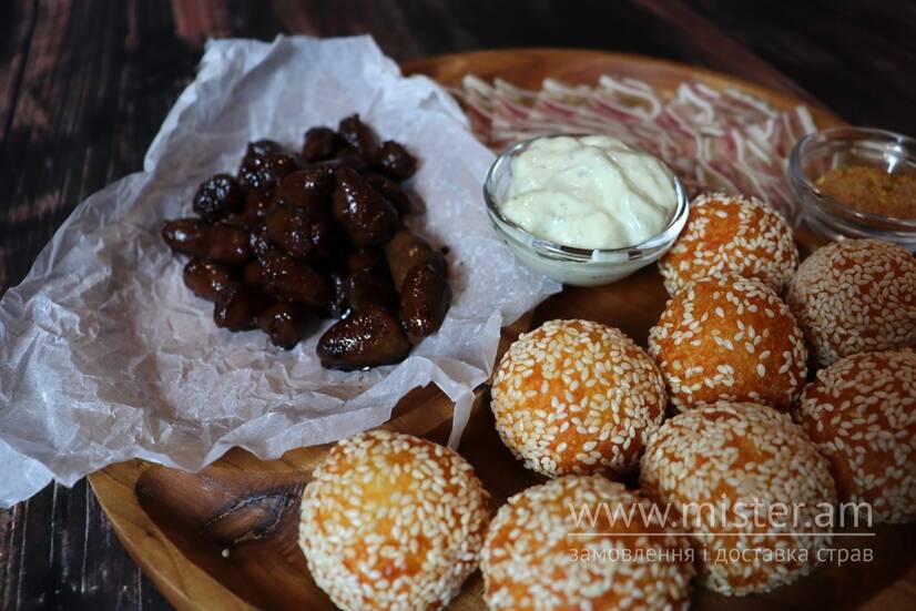 Свинні вушка, сердечка у соєвому соусі, сирні кульки.