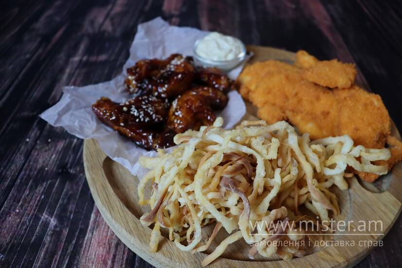 Крила апетитні, нагетси, сулугуні фрі, соус тартар.