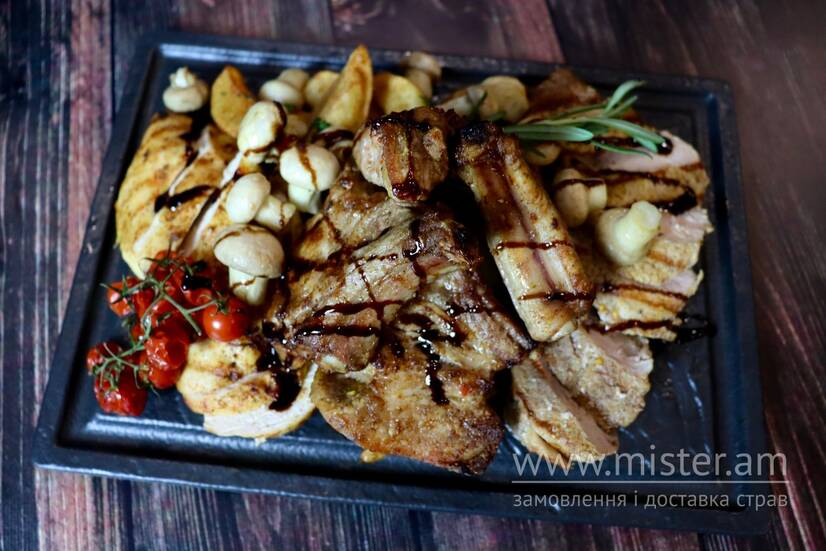 Філе куряче, філе свинне, свинні ребра, картопля, шампіньйони.
