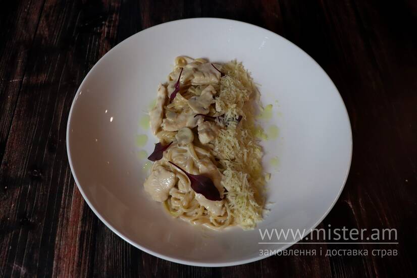 Паста, бекон, жовток, цибуля, пармезан, соус вершковий.