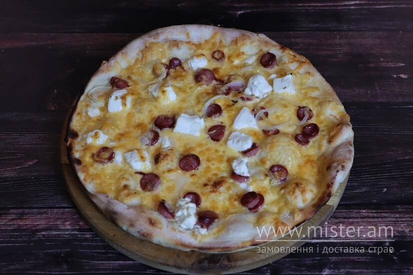 Соус вершковий, сир твердий, сир фета, ковбаски мисливські, цибуля маринована.