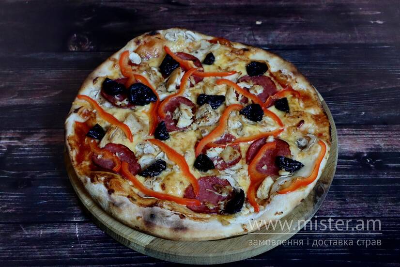 Соус томатний, сир твердий, шампіньйони, чорнослив, куряче філе, папероні, болгарський перець.
