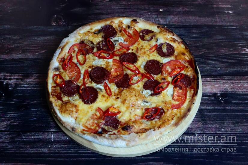 Соус томатний, сир твердий, шампіньйони, папероні, помідори, перець чилі.