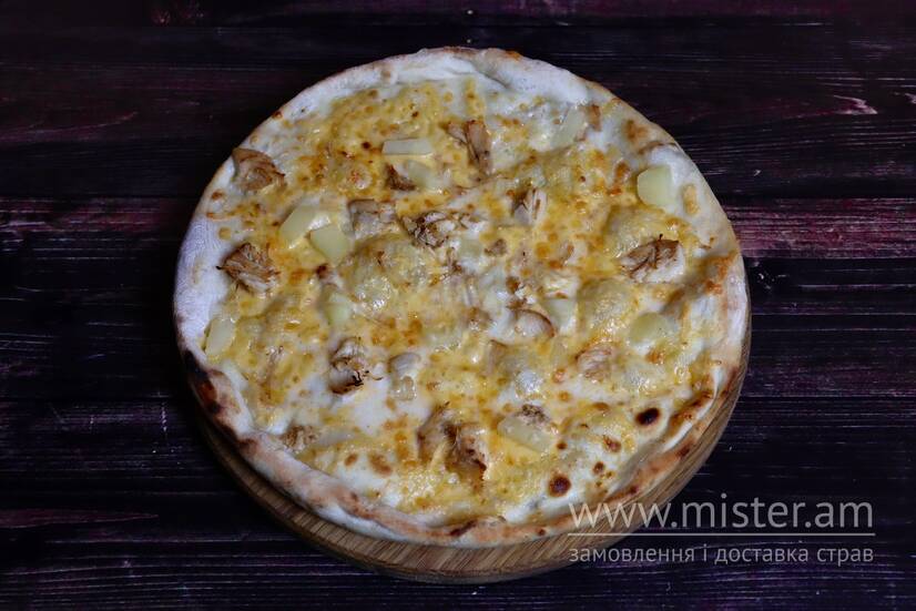 Соус вершковий, сир твердий, сир моцарелла, ананас, куряче філе.