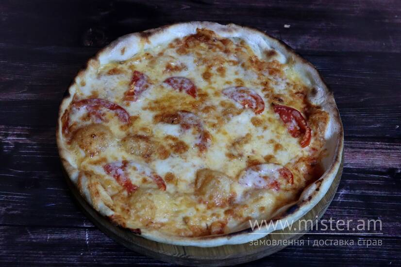 Соус томатний, сир моцарелла, сир твердий, помідори.