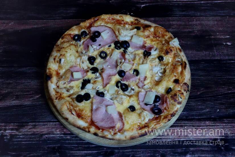 Соус томатний, сир твердий, шампіньйони, ананас, куряче філе, шинка, маслини.