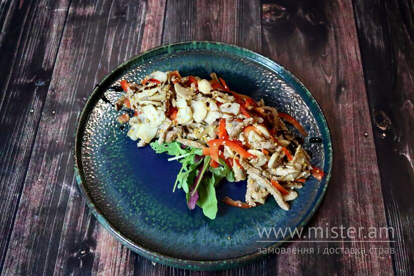 Свинна вирізка, шампіньйони, болгарський перець, кунжут, гірчиця, лимон.