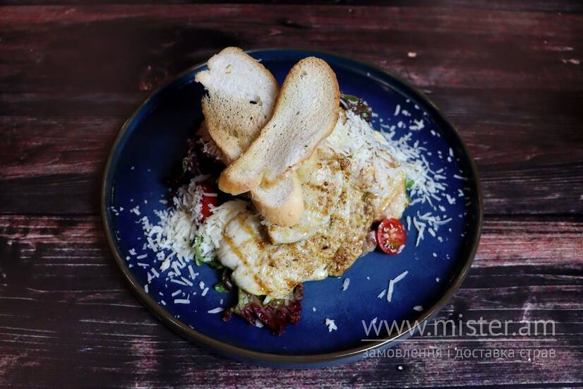 Мікс салату, соус авторський, філе куряче, томати, бекон, перепелині яйця, пармезан.