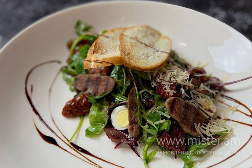 Язик, перепелині яйця, в`ялені томати, мікс салату, пармезан.