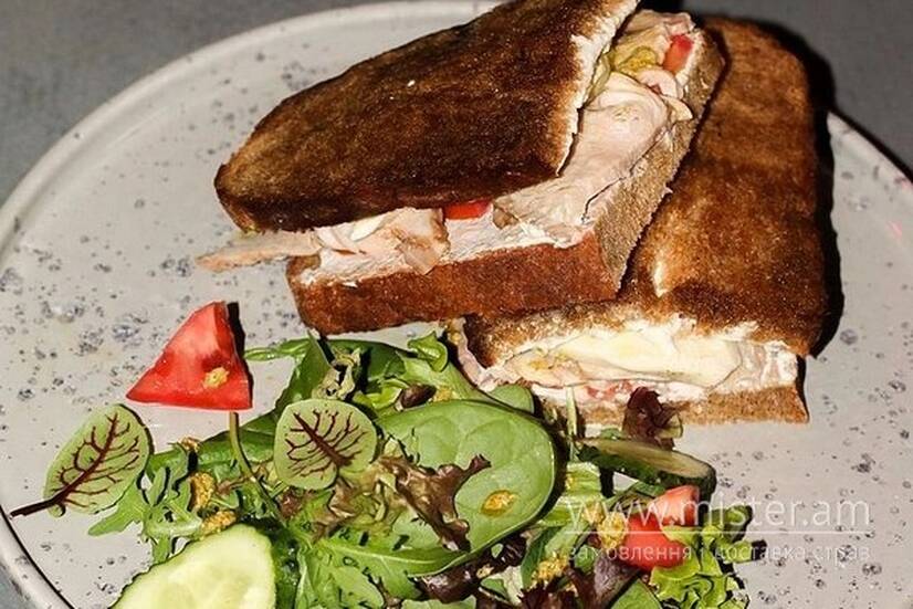 Запечена свинина, крем-сир, моцарела, солодовий хліб власного виробництва, мікс салату, помідори, огірки, соус песто.