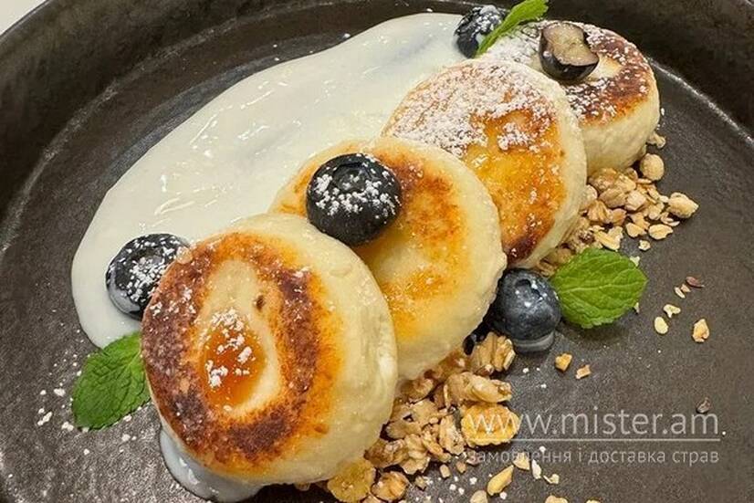 Йогурт грецький, лохина, м`ята, гранола, сирники.