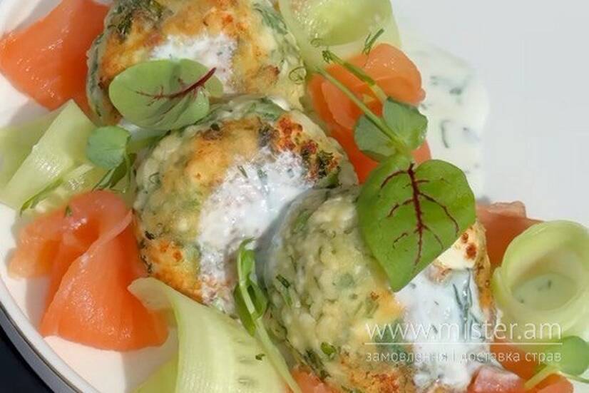 Сирники солоні з петрушкою та кропом, лосось слабосолений, огірок свіжий, соус йогуртовий власного виробництва.