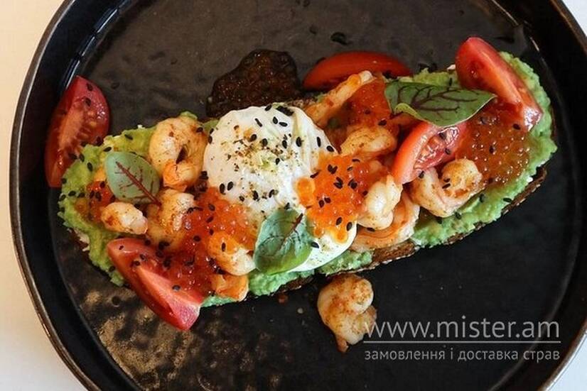 Хліб кунжутний власного виробництва, яйце пашот, крем сир, авокадо, креветки, ікра червона, помідори чері.