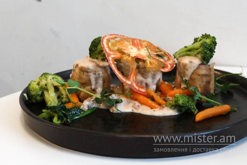 Курячі медальйони су-від, броколі, морква, шпинат, цибуля, вершковий соус з томатами.