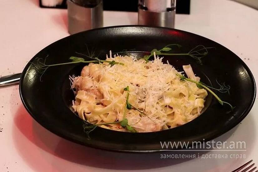 Паста, смажена курка, печериці, часник, вершки, пармезан, мікрогрін.