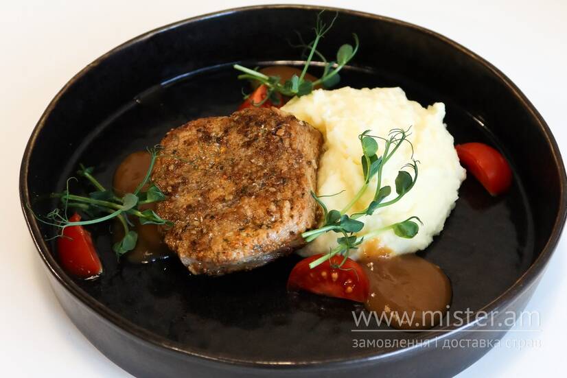 Стейк свинний, картопляне пюре, томати чері, соус деміглас, мікрогрін.