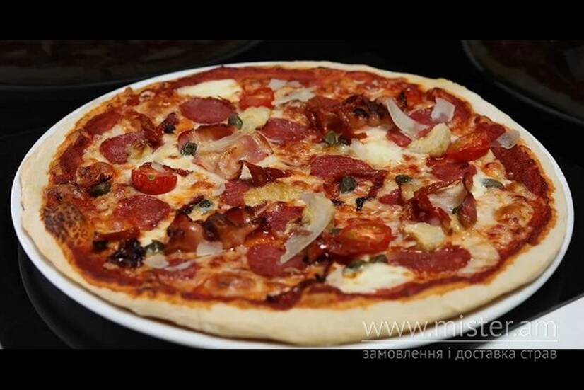 Ковбаса салямі, бекон, моцарелла, помідори в`ялені, томати черрі, каперси, артішоки, томатний соус, руккола.