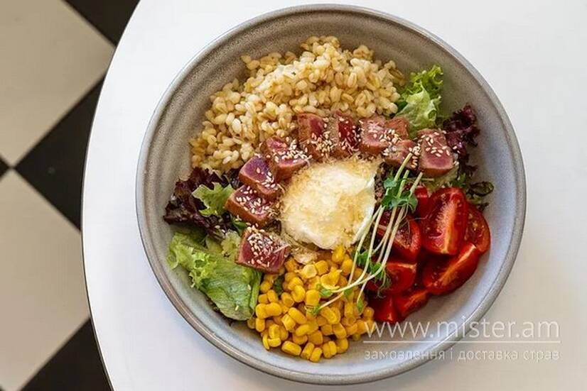 Стейк тунця, яйце пашот, булгур, мікс салату, чері, кукурудза консервована, кунжут, лимонний дресинг, мікрогрін.